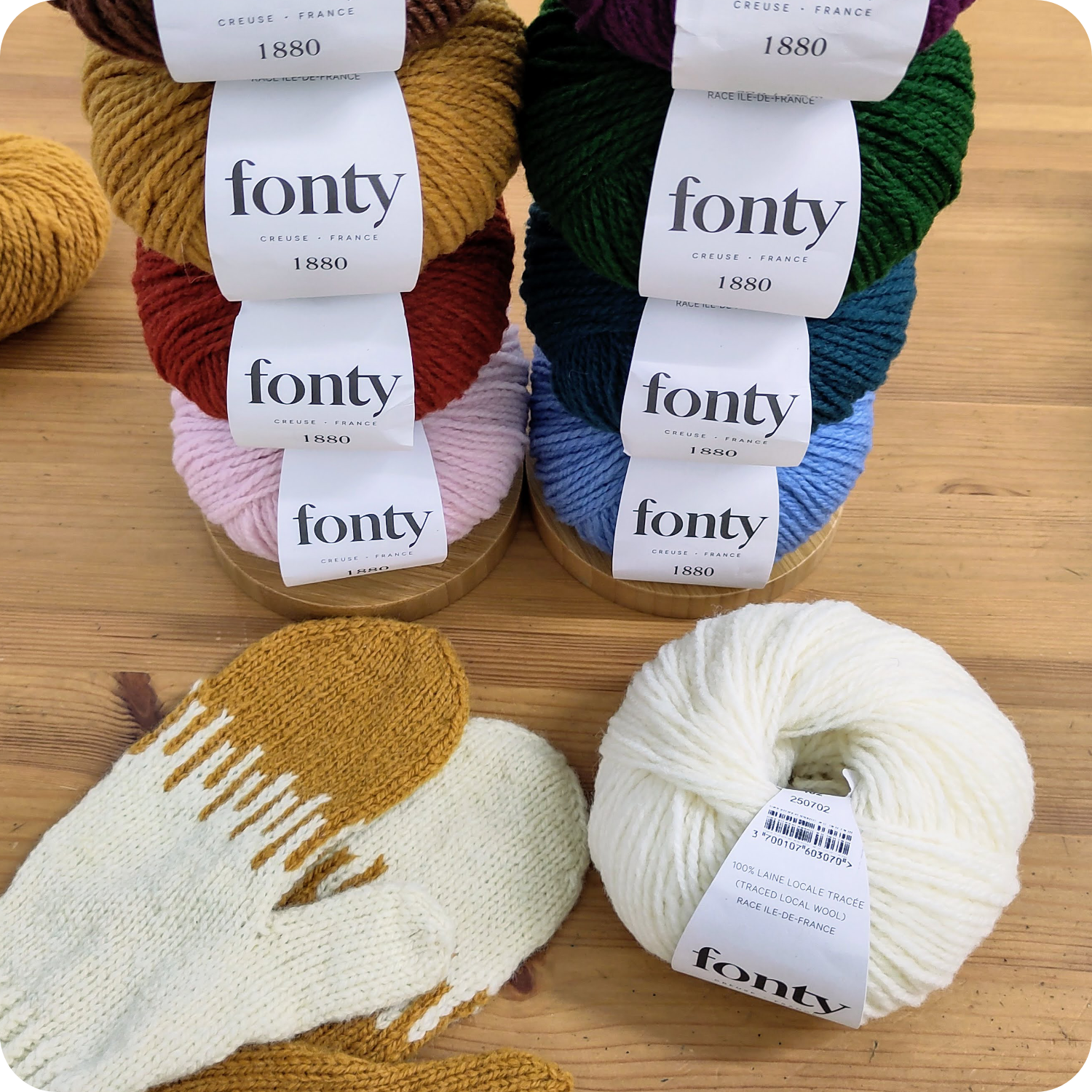 Im Preis enthalten sind 2 Knäuel Wolle (Fonty – 1880), die du dir beim ersten Termin aussuchen kannst.